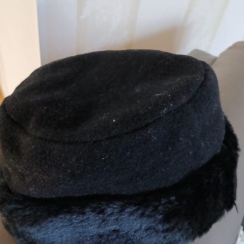 Prahasta ostettu upea, käsintehty naisten villakangasmainen hattu. Sopii 58 cm päänympärykselle. Lierin leveys edessä 7,5 cm, takana 6,5 cm.