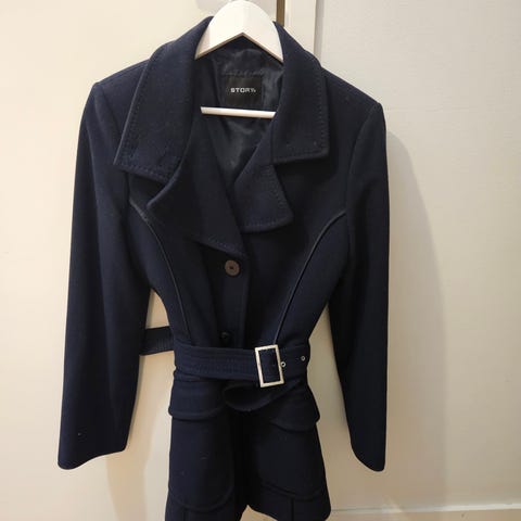 Myydään naisten villakankainen vuorillinen takki. Tumma mustansininen, koko 38. Pitkä vetoketju, naisellinen kaulus monikäyttöisesti käännettävissä. Pieni halkio alhaalla. Villakangas 60% villaa, 40% viskoosia. Pituus 81 cm, kai-kai -mitta 50 cm. Vähän käytetty, hyvässä kunnossa. Hinta 12€ Nouto Helsinki tai Toridiili.