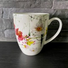 Uudenveroinen muki kukkakoristeilla ja kultareunoilla.