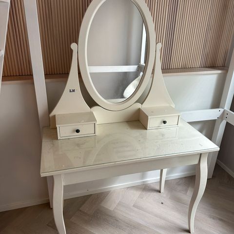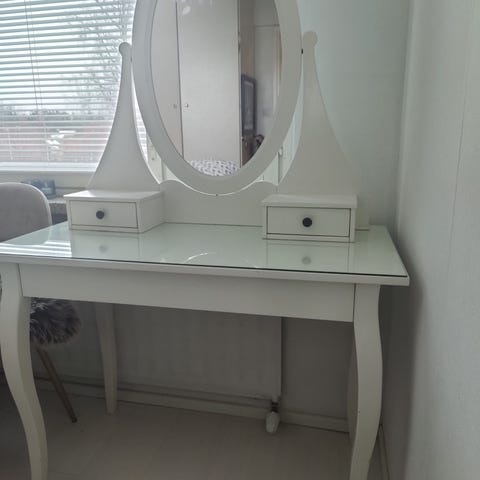 Myydään todella siisti, hyväkuntoinen kampauspöytä. Ikea Hemnes -sarjaa. Muutama käytönjälki löytyy jaloissa sekä vasemmanpuolen kulmassa, peili ja lasi täysin ehjät.