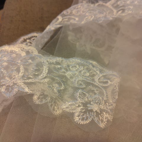 Puhtaanvalkoinen huntu. Kiinnitetään hiuspinnillä kampaukseen.