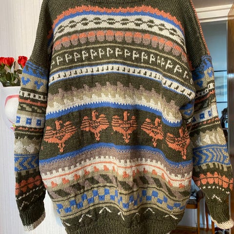 Uusi kasin koostuu paksu ja lämmin villapaita. Ehkä XL koko. Itse 190 cm pitkä ja noin 90 kg ja on sopiva.
