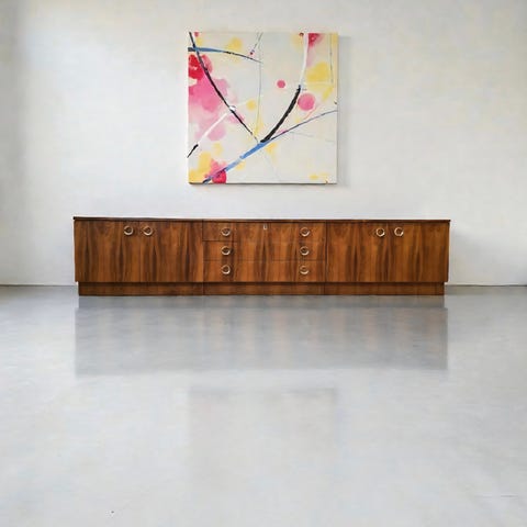 Kaunis, tummanruskea / keskiruskea pähkinäpuuviilutettu senkki / tv-taso. Senkki koostuu kahdesta 90 cm leveästä osasta. Senkin syvyys vetimien kanssa on 49 cm.