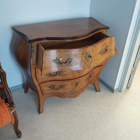Myytiin vanha / antiikkinen ja kaunis peilipiironki. Täyttä puuta ja erikoishiottu ehjä peili. Muuten hyväkuntoinen ja ehjä paitsi alalaatikon vetimistä molemmista lähtenyt pienipala alareunasta (näkyy kuvassa). Samoin tason takareunan pinnassa pieni lommo joka jää pikkukaappien alle piiloon. Viat otettu jo huomioon hinnassa. Laatikot toimii ja pohjatkin ehjät.
