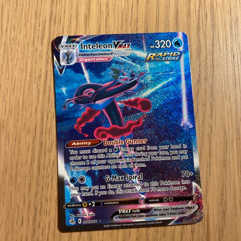 Myynnissä Inteleon Vmax pokemon-kortti. Aito ja täydellinen kunto ofc. Hintaa ja arvoa kortilla jonkun verran.