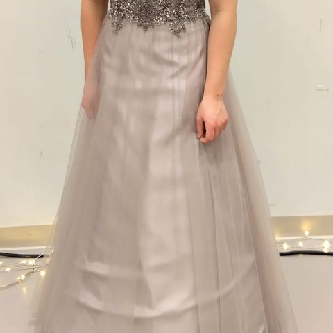 Kerran käytetty tumman harmaa vanhojentanssimekko. Koko noin 36-38 ja pituudeltaan sopii noin 160cm pitkälle. Takana vetoketju ja sisällä korsettiluut. Vannehame kuuluu hintaan mukaan.