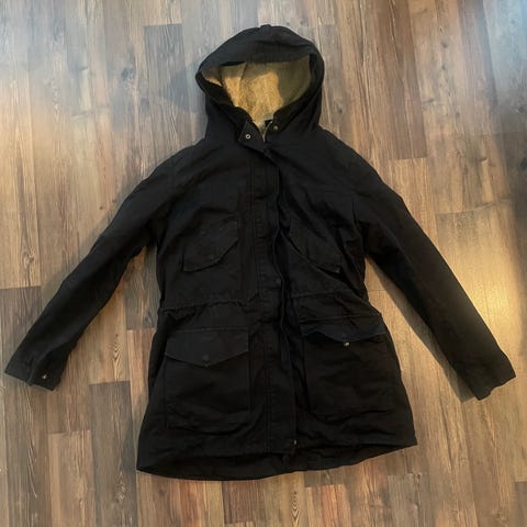 Irroitettava lämpövuori ja hupun reunuskarva vuosien saatossa kadonneet mutta takkia voi käyttää hyvin välikausitakkina tai teettää siihen uuden lämpövuoren. Takkia ei ole pesty kertaakaan ja yleisilme on siisti. Ollut siis hyvin vähäisellä käytöllä. Isot napilliset taskut ja sisäpuolella vetoketjullinen povitasku. Vyötäröllä kiristysnauha jota voi säätää takin sisäpuolelta. Takki on joustavaa materiaalia ja siinä on Aquatx-käsittely(vedenpitävyys), joka aktivoidaan pesun jälkeen silittämällä kangas.