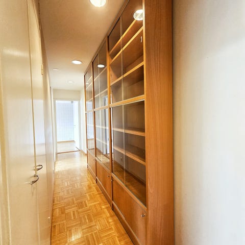 Kolmessa osassa. Sivuilla alhaalla kaapit ja lasi hyllyt ja keskellä 2 laatikkoa. Hyllyihin mahtuu 2 riviä kirjoja eli monta metriä. Leveys 60 cm ja 80 cm
