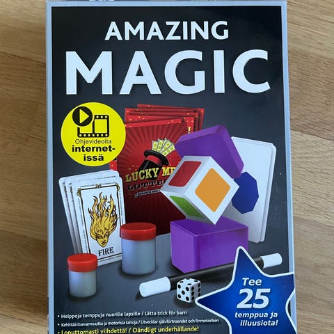 Taikatemppusetti. Kaikki muut osat pitäis olla tallessa, mutta osa pelikorteista hukkunut matkalla.