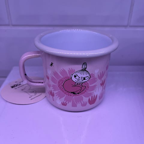Käytössä ollut mutta edelleen siistikuntoinen Muumipappa ja Muumimamma -aiheinen muki. Muurla -merkkinen. Kissatalous.
