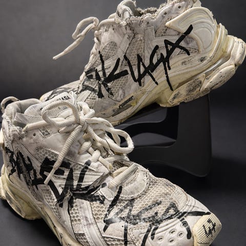 Balenciaga Triple S tennarit, koko 44. Väriltään beige / hiekanruskea. Paksupohjainen malli, jossa monikerroksinen kumipohja ja nauhakiinnitys. Päällinen koostuu useista paneeleista, joissa Balenciaga-logopainatukset. Kengät soveltuvat vapaa-aikaan ja arkikäyttöön. Mukana näkyy alkuperäinen laatikko ja varanauhat kuvien mukaisesti.