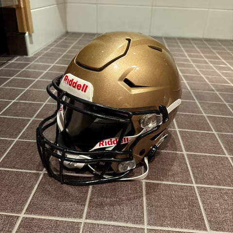 Riddell Football-kypärä valkoisella värillä. Kypärässä on suojus kasvojen edessä ja ilmanvaihtoaukot. Kypärä on suunniteltu tarjoamaan suojaa amerikkalaisen jalkapallon pelaajille. Käytetty noin puolitoista kautta yhden henkilön toimesta, näkyvissä käytön jälkiä ja naarmuja pinnassa. Kulkeutuu tarvittaessa Ouluun tai Rovaniemelle.