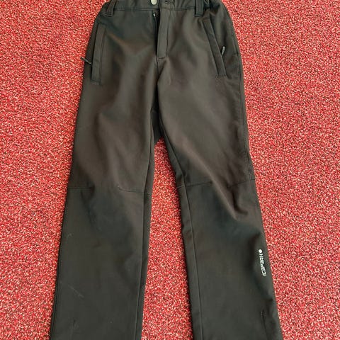 Softshell housut. Kokomerkintä 116, mutta menee vasta 128 koossa. Polvivahvikkeiden uloimmassa kankaassa pienet reiät.