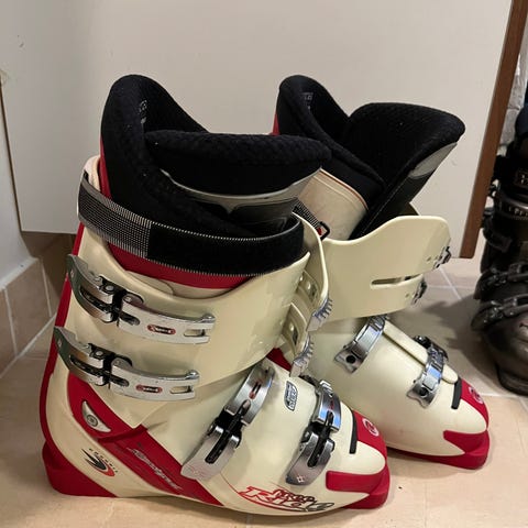 Rossignol X-8 Pro laskettelumonot, harmaa ja oranssi väri, 355mm. Sisämitta n.30cm. Muovinen ulkokuori, neljä solkea kiinnityksessä. Sisävuori pehmustettu. Soveltuu lasketteluun ja tarjoaa tukea ja mukavuutta jalalle.