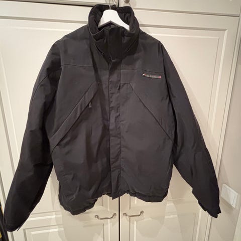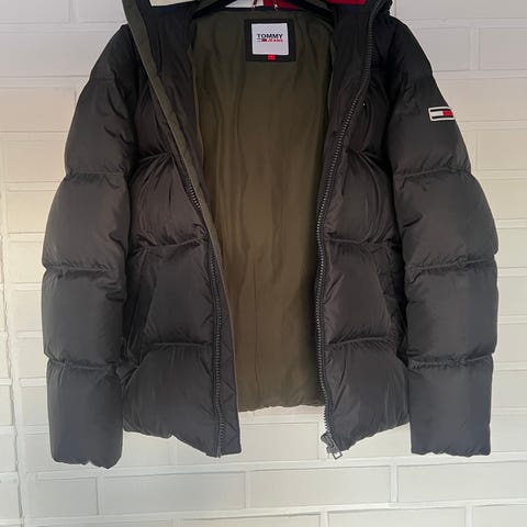 Tommy Hilfiger tummansininen untuvatakki koossa XL, mielestäni enemmän kokoa M on, sillä käytän muuten L vaatteita ja tuo minulle pieni. Takissa on sekä irroitettava huppu että karvareunus. Hihat ovat joustinneulosta ranteissa. Takissa on etutaskut isoilla napeilla ja pienemmät taskut korkeammalla.