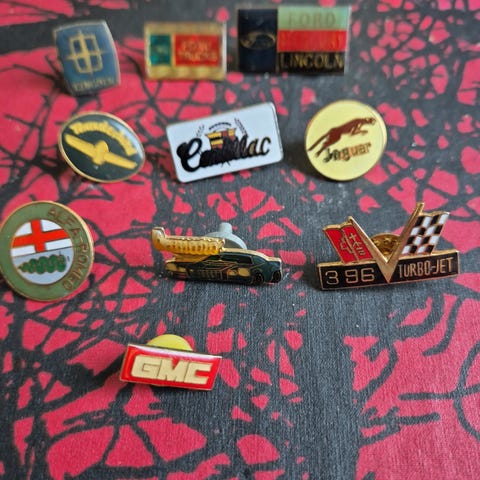 old Jaguar red & green (1954-57) convertibles 8e kpl, vintage black Rolls Royce (3 kpl/10e kpl). Vintage old fashion car vehicle pins (7e), vintage automobile Ford model T pins (7e),