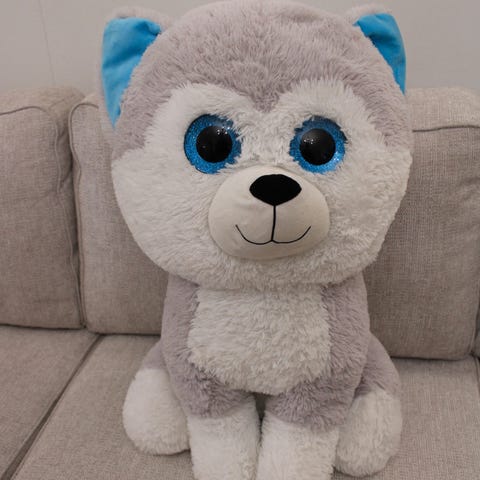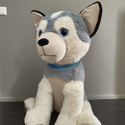 Kuvanmukainen Husky koira reppukoriste. Korkeus n. 10,5cm. Siistikuntoinen.