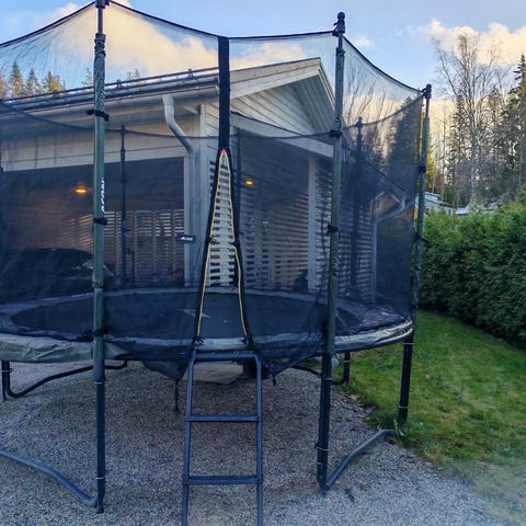 Trampoliinissa on runko kasattuna, muuten purettuna tällä hetkellä. Kankaat säilytetty sään suojassa. Runko purettava pihalta ennen kuljetusta, voin itse auttaa siinä.