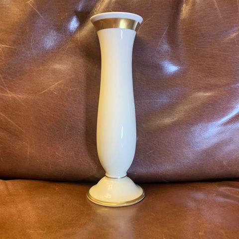 Saksalainen Vintage maljakko valkoista posliinia, kultaisella lehtikuvioinnilla. Maljakon pohjassa on valmistajan signeeraus. Ehjä.