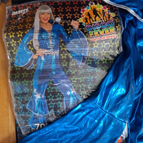 Valmis setti naamiaisiin: Discohaalari, peruukki ja aurinkolasit.