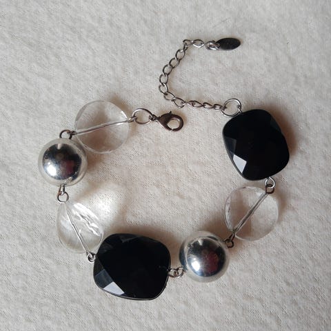 Pienistä puuhelmistä tehty monikerroksinen rannekoru. Mukavan joustava myös.