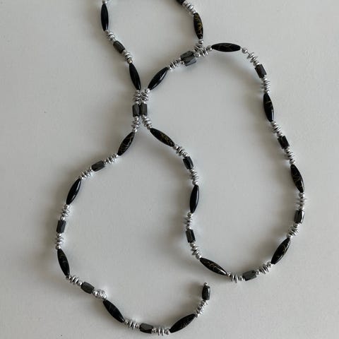 Vihreäsävyinen pitkä rannekoru jonka voit kieputtaa ranteen ympärille niin monta kertaa kuin haluat ja koru pysyy muodossa magneetin avulla.