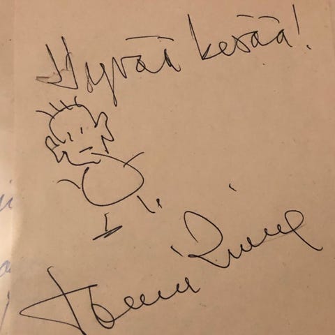Linn Ullmannin nimikirjoitus lehtikuvassa. Saatu 27.2.1989 henkilökohtaisesti.