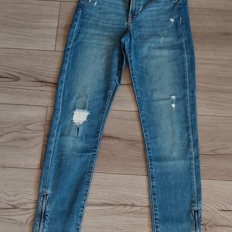Käytetyt farkut. Korkea vyötärö. Vetskarit lahkeissa.