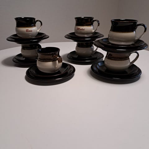 Uudet kaapista Kermasaven Heinäsarjaa olevat 8kpl kahvikupit+aluslautaset+pullalautaset.2kpl Sokerikko+2 kpl kermakko iso ,sekä 1kpl pieni. Lisänä tulee 6 kpl mukeja ilman lautasia. Tuotanko lopetettu v 2007 Yhteish. 60 e+pk