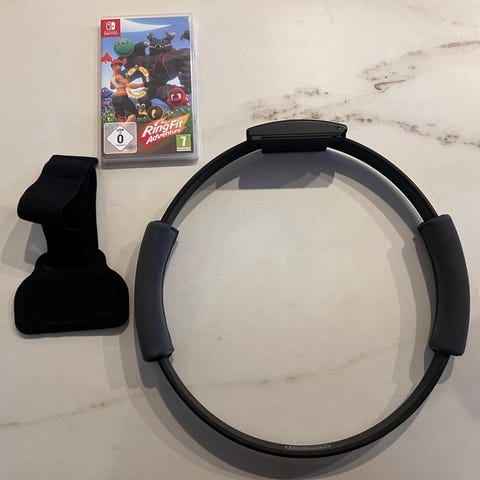 Ring Fit Adventure Nintendo Switch -peli ja lisävarusteet, Ring-Con-ohjain sekä jalkahihna.