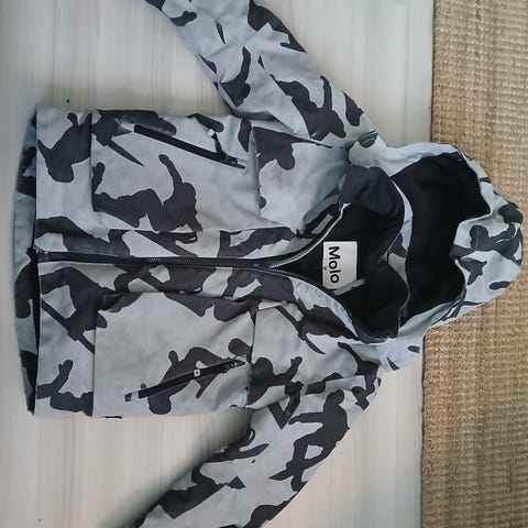 Paljon käytetty Molon laskettelutakki koossa 140. Lumilukot. Hihansuissa jo kulumaa ja samoin alhaalla edessä, jossa pieni reikä. Muuten ei mainittavaa ja yleisilme hyvin siisti. Kivasti vetoketjullisia taskuja.