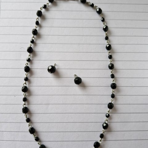 Pitkähkö kaulanauha mustilla muovirenkailla ja kirkas/viininpunaisilla muovihelmillä.
