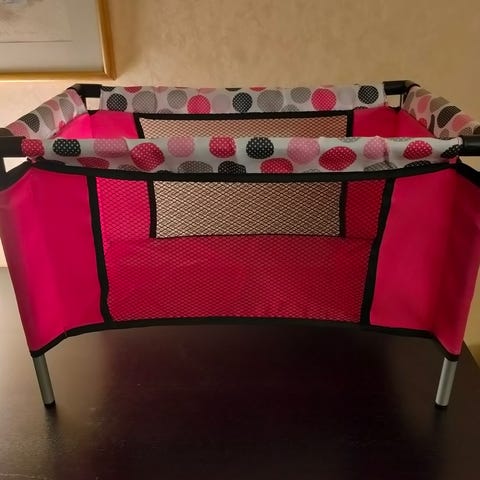 Myydän priimakuntoinen tukeva matkasänky nukelle. Sopii enintään 45 cm pitkälle nukkujalle. Sängyn pituus 54 cm, leveys ja korkeus 30,5 cm. Metallinen runko, muoviset liitospalat. Vain nouto