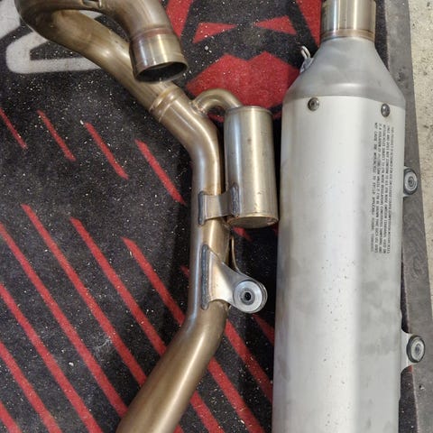 KTM 250 exc-f pakoputki 2014 vuosimallista. On elämää nähnyt lommot putkessa ja äänenvaimentimeen joskus piikkipyörät kuluttanut puhki ja on paikattu.