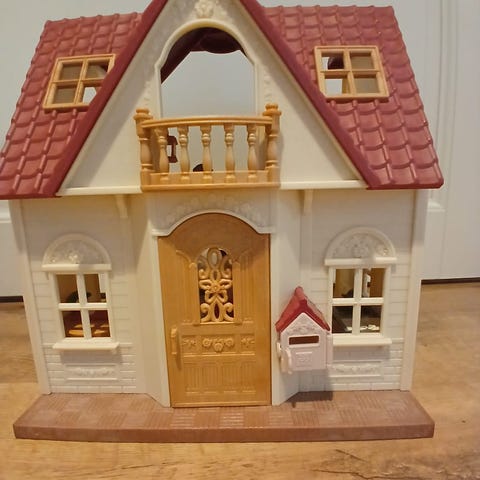 Myynnissä kaksikerroksinen Sylvanian Families -talo, vessa ja kissaperhe.