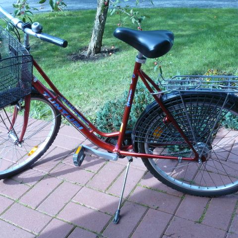 DBS Kaupunki- ja taittopyörä, punainen väri, unisex-malli. Pyörä soveltuu kaupunkiajoon ja taittopyöräilyyn. Varustettu etu- ja takalokasuojilla, metallirunko ja perinteiset v-jarrut. Pyörässä on tavarateline takana.