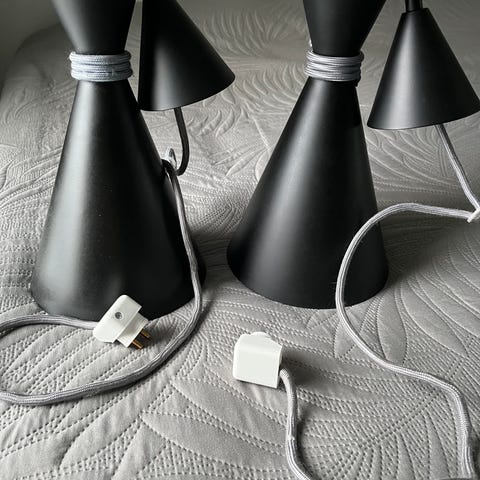 Kaksi kpl valkoisia, metallisia kattovalaisimia.