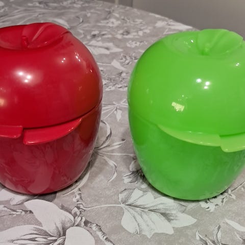 Omenanmuotoinen Tupperware-rasia, joka on tarkoitettu hedelmien säilytykseen/ kuljetukseen. Voi myös esim. säilyttää pikkutavaraa jne