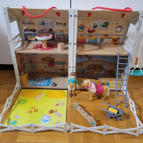 Hape merkkinen hevostalli, hevonen, ratastaja ja aitaus. Pieni ratsastus koulu. Mitat: 29 x 35 x 24 cm valmistajan sivuilta katsottuna.