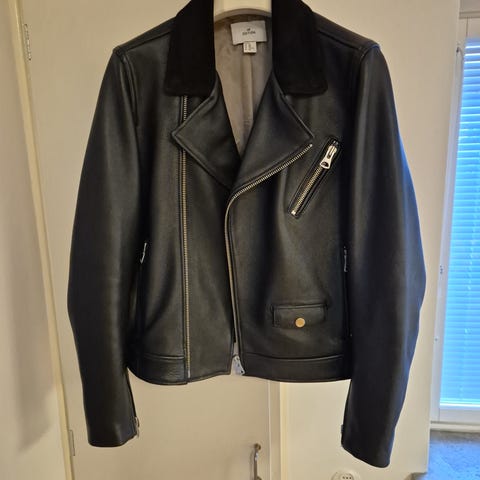 Kuvan mukaan musta nahkatakki ,pituus 90 cm, käyttämätön.