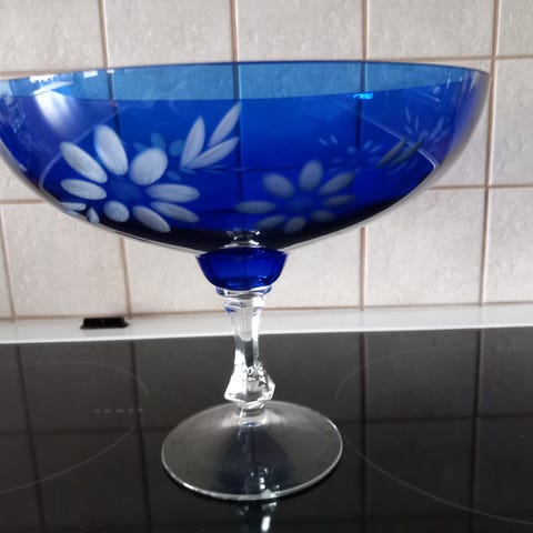 Myydään kuvan mukainen jalallinen venäläinen "kristalli" lasimalja. Mitat: korkeus 15,5 cm, syvyys 6 cm ja halkaisija 13 cm. Kuviot on lasikaiverrettu.
