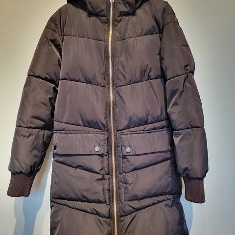 Lämmin, muhkea musta toppatakki. Huppu neppareilla, taskut vetoketjulla. Yhden talven käytössä ollut, uutena ostettu. Käytetty kunto, poikkeamista kuvat, selässä jälki, joka ei lähtenyt pesussa (en laittanut tahranpoistoa). Hihoissa saumojen kohdalla muutama pieni kulumajälki. Kerran pesty, joten lämpöarvo vielä hyvä. Koiratalous.