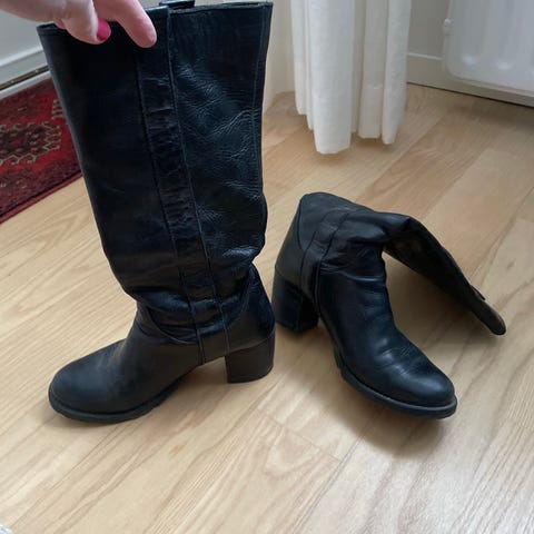 Upeat italialaiset nahkasaappaat, nahkaa sisältä ja päältä. Tukeva korko, ja hyvässä kunnossa oleva kuvioitu pohja, joten näillä ei liukastele niin helposti pikkupakkasilla. Nahkaa sisältä, ei siis erityisesti muutoin vuoritettu. Ulkoreunassa ylhäälle ulottuva kullanvärinen feikkivetoketju, varsinainen vetoketju on sisäsaumassa piilossa (kts kuva). Pohjaa kiertää kullanvärinen sauma, joka tosin pienesti kulunut paikoin, siisti silti edelleen (kts kuvat). Korko päällystetty niin aavistuksen kärsinyt kosteudesta (kts kuvat).