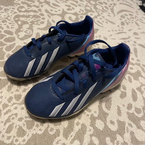 Adidas lasten tennarit, värit valkoinen ja sininen. Kenkien yläosa on valmistettu verkkomateriaalista ja keinonahasta. Kiinnitys tapahtuu kolmella velcro-tarranauhalla. Kumipohja tarjoaa pidon erilaisilla pinnoilla. Kenkien koko ei ole tiedossa kuvista.
