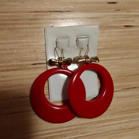 Retro-korvakorut, punaiset. Oletettavasti bakeliittia, painavat hieman.
