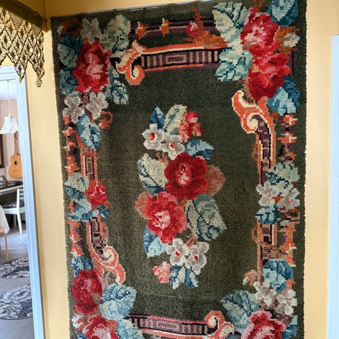 Hyväkuntoinen 70-luvun seinäryijy ruusukuviolla.