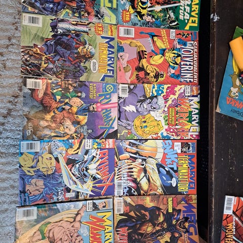 38kpl Marvel sarjiksia, joista 37kpl on suomenkielisiä ja yksi ruotsalainen. Osa todella luettuja ja kuluneita ja osa huomattavasti paremmassa kunnossa. Löytyy Daredevil, Hulk, Aaveajaja, Tuomari, Wolverine, Hämähäkkimies, Ryhmä-X jne jne. Kaikki kerralla. Kuvasta puuttuu Marvel Namor (no 9 1994), joka kuuluu kauppoihin myös.