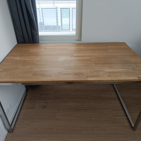 Kuvan mukainen työpöytä. Ikea Alex lipasto toisessa päässä ja toisessa päässä puinen mustaksi maalattu jalka. Kansi 26mm tammesta tehty liimapuulevy. Lipasto ei kiinni kannessa, joten kuljetus onnistuu helpommin. Kannessa muutamia läikkiä, mutta kevyt hionta ja öljy varmaan auttaisi. Muutoin siisti.