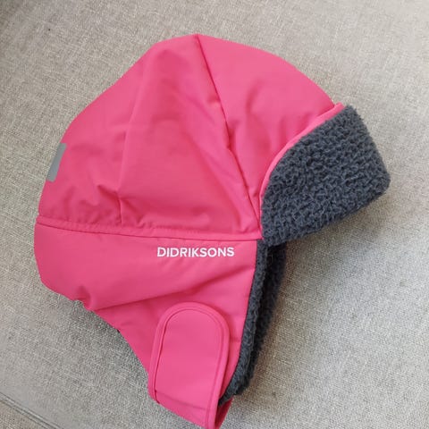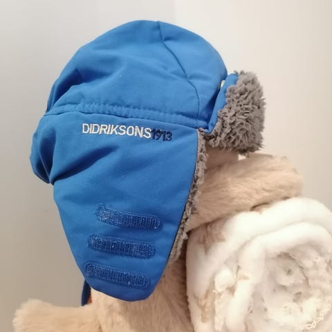 Hattu on valmistettu lämpimästä materiaalista, jossa on pehmeä harmaa vuori ja veden- sekä tuulenpitävä päällinen. Koko 54. Kevyttä tummentumaa leukahihnan reunassa pienellä alueella. Tämän sai kyllä syynätä aika läheltä. Yleisilmeeltään siisti ja ehjä.