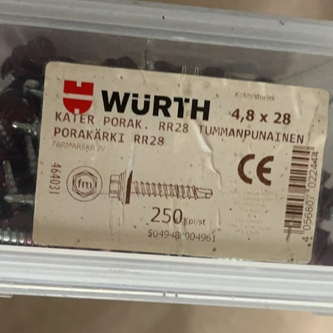Kateruuvi 4,8 x 65mm , sähkösinkitty, väri sinkki, aluslevyllä ja tiivisteellä. 150 kpl/laatikko. Laatikko avaamaton. Löytyy 2 ltk.